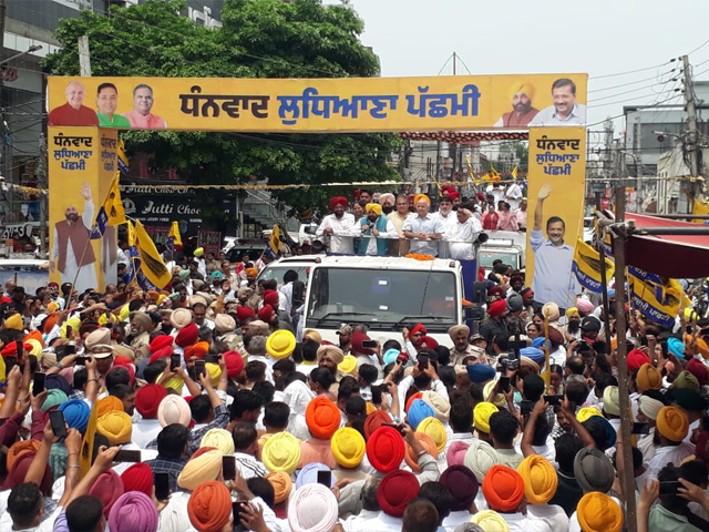 ਲੁਧਿਆਣਾ, 24 ਜੂਨ – ਲੁਧਿਆਣਾ ਜ਼ਿਮਨੀ ਚੋਣ ਵਿਚ ਆਮ ਆਦਮੀ ਪਾਰਟੀ ਦੇ ਉਮੀਦਵਾਰ ਸੰਜੀਵ ਅਰੋੜਾ ਦੀ ਜਿੱਤ ਉਪਰੰਤ ਮੁੱਖ ਮੰਤਰੀ ਭਗਵੰਤ ਮਾਨ ਅਤੇ ਮਨੀਸ਼ ਸਿਸੋਦੀਆ ਲੋਕਾਂ ਦਾ ਧੰਨਵਾਦ ਕਰਨ ਲਈ ਲੁਧਿਆਣਾ ਵਿਖੇ ਰੋਡ ਸ਼ੋਅ ਕਰ ਰਹੇ ਹਨ। ਇਹ ਰੋਡ ਸ਼ੋਅ ਘੁਮਾਰ ਮੰਡੀ ਤੋਂ ਸ਼ੁਰੂ ਹੋ ਕੇ ਆਰਤੀ ਚੌਕ ਤੱਕ ਜਾਵੇਗਾ, ਜਿਸ ਦਾ ਰਸਤਾ ਅੱਧਾ ਕਿਲੋਮੀਟਰ ਹੈ। ਇਸ ਮੌਕੇ ਵੱਡੀ ਗਿਣਤੀ ਵਿਚ ਆਮ ਆਦਮੀ ਪਾਰਟੀ ਦੇ ਸਮਰਥਕ ਅਤੇ ਆਗੂ ਹਾਜ਼ਰ ਹਨ। ਇਸ ਮੌਕੇ ਅਮਨ ਅਰੋੜਾ ਅਤੇ ਲੁਧਿਆਣਾ ਦੇ ਵਿਧਾਇਕ ਵੀ ਉਨ੍ਹਾਂ ਦੇ ਨਾਲ ਹਨ।