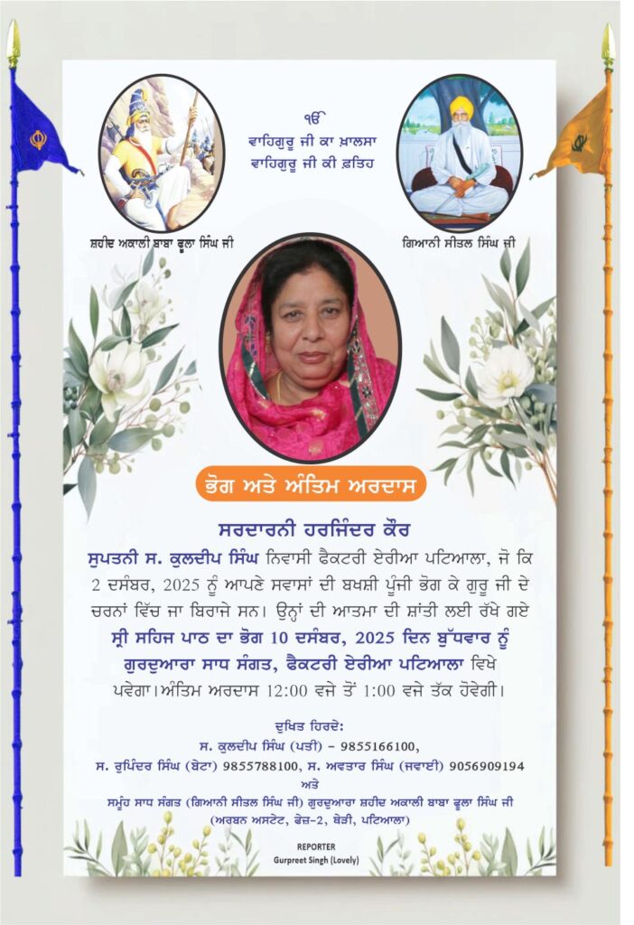 Homeਧਰਮਭੋਗ ਅਤੇ ਅੰਤਿਮ ਅਰਦਾਸ ਧਰਮ ਭੋਗ ਅਤੇ ਅੰਤਿਮ ਅਰਦਾਸ By Choudhary Chhatarpal Singh December 8, 2025 0 328 Share Facebook Twitter Pinterest WhatsApp Tags#Bhog & Antim Ardas Share Facebook Twitter Pinterest WhatsApp Previous articleਅੱਜ ਦਾ ਹੁਕਮਨਾਮਾ (08 ਦਸੰਬਰ 2025) (Ang 742)Next articleਗੁਟਕਾ, ਪਾਨ ਮਸਾਲਾ ਤੇ ਨਸ਼ੀਲੇ ਫਲੇਵਰ ਵੇਚਣ ‘ਤੇ ਪੂਰਨ ਪਾਬੰਦੀ Choudhary Chhatarpal Singhhttps://shaheedeazamnews.com/ RELATED ARTICLES Video #Live Rehras sahib from shaheed akali baba phula singh patiala dated 7-3-26 March 7, 2026 Video #Live ‘Aasa Di Vaar’ Gurdwara Shaheed Akali Baba Phula Singh Ji 7-3-2026 March 7, 2026 Video Live 6.3.2026 Rehraas sahib katha @ Shaheed Akali Baba Phula Singh Patiala March 6, 2026 - Advertisment - Most Popular ਪਟਿਆਲਾ—ਪ੍ਰਾਚੀਨ ਸ਼੍ਰੀ ਵਾਮਨ ਅਵਤਾਰ ਮੰਦਿਰ ਬਚਾਉਣ ਲਈ 9 ਮਾਰਚ ਤੋਂ ‘ਮਰਨ ਵਰਤ’ March 7, 2026 ਰੈਪਰ ਬਾਦਸ਼ਾਹ ਦੇ ਗੀਤ ’ਤੇ ਵਿਵਾਦ, ਪੰਚਕੂਲਾ ਸਾਈਬਰ ਥਾਣੇ ਵਿੱਚ ਐਫਆਈਆਰ ਦਰਜ: March 7, 2026 #Live Rehras sahib from shaheed akali baba phula singh patiala dated 7-3-26 March 7, 2026 ਅੰਮ੍ਰਿਤਸਰ ਵਿੱਚ ਪੁਲਿਸ ਕਾਂਸਟੇਬਲ ਦਾ ਕਤਲ, ਸਿਰ ਵਿੱਚ ਰਾਡ ਮਾਰ ਕੇ ਕੀਤੀ ਹੱਤਿਆ: March 7, 2026 Load more Recent Comments