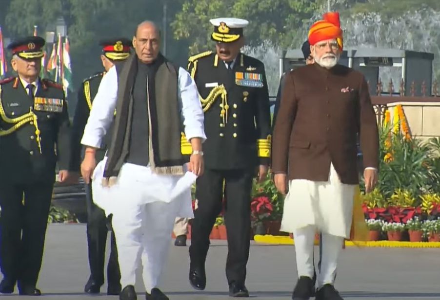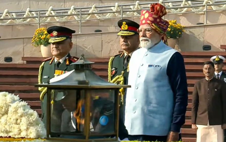 - ਮੁੱਖ ਮਹਿਮਾਨਾਂ ਦੀ ਮੌਜੂਦਗੀ: ਰਾਸ਼ਟਰੀ ਯੁੱਧ ਸਮਾਰਕ ‘ਤੇ ਪਹੁੰਚਣ ‘ਤੇ ਰੱਖਿਆ ਮੰਤਰੀ ਰਾਜਨਾਥ ਸਿੰਘ ਨੇ ਪ੍ਰਧਾਨ ਮੰਤਰੀ ਦਾ ਸਵਾਗਤ ਕੀਤਾ। ਇਸ ਮੌਕੇ ਚੀਫ਼ ਆਫ਼ ਡਿਫੈਂਸ ਸਟਾਫ਼ (CDS) ਅਤੇ ਤਿੰਨਾਂ ਸੈਨਾਵਾਂ (ਥਲ ਸੈਨਾ, ਜਲ ਸੈਨਾ ਅਤੇ ਹਵਾਈ ਸੈਨਾ) ਦੇ ਮੁਖੀ ਵੀ ਮੌਜੂਦ ਸਨ।