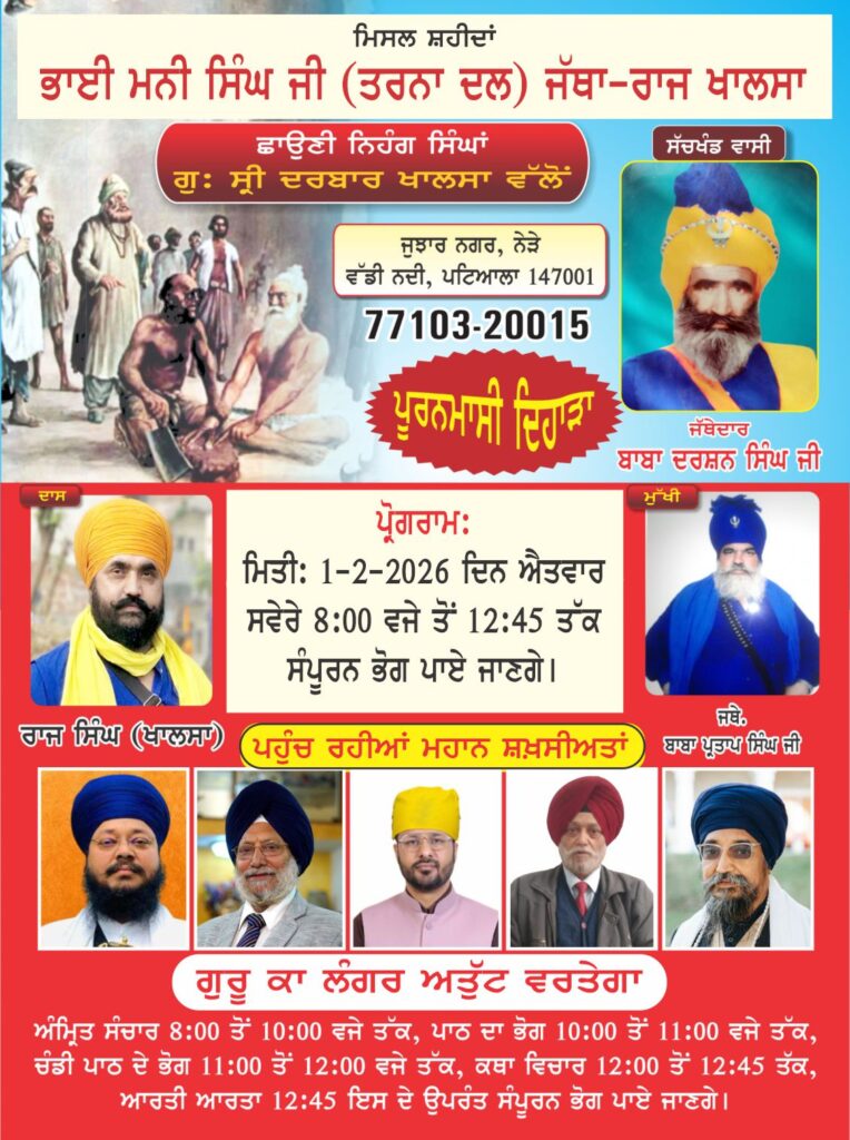 ਪਟਿਆਲਾ ਅਪਡੇਟ ਮਿਸਲ ਸ਼ਹੀਦਾਂ ਭਾਈ ਮਨੀ ਸਿੰਘ ਜੀ (ਤਰਨਾ ਦਲ) ਜੱਥਾ—ਰਾਜ ਖਾਲਸਾ ਵਲੋਂ ਪੂਰਨਮਾਸ਼ੀ ਦਿਹਾੜਾ 1 ਫਰਵਰੀ ਨੂੰ By Choudhary Chhatarpal Singh - January 31, 2026 0 Facebook Twitter Pinterest WhatsApp