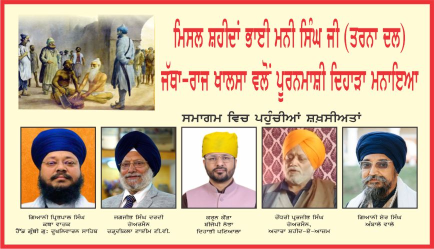 ਪਟਿਆਲਾ, 1 ਫਰਵਰੀ (ਛਤਰਪਾਲ ਸਿੰਘ): ਮਿਸਲ ਸ਼ਹੀਦਾਂ ਭਾਈ ਮਨੀ ਸਿੰਘ ਜੀ (ਤਰਨਾ ਦਲ) ਜੱਥਾ—ਰਾਜ ਖਾਲਸਾ ਵੱਲੋਂ ਅੱਜ ਪੂਰਨਮਾਸ਼ੀ ਦਾ ਪਵਿੱਤਰ ਦਿਹਾੜਾ ਬੜੀ ਸ਼ਰਧਾ ਅਤੇ ਉਤਸ਼ਾਹ ਨਾਲ ਮਨਾਇਆ ਗਿਆ। ਇਸ ਧਾਰਮਿਕ ਸਮਾਗਮ ਵਿੱਚ ਪੰਥ ਦੀਆਂ ਮਹਾਨ ਸ਼ਖ਼ਸੀਅਤਾਂ ਅਤੇ ਇਲਾਕੇ ਦੇ ਪਤਵੰਤੇ ਸੱਜਣਾਂ ਨੇ ਸ਼ਿਰਕਤ ਕਰਕੇ ਗੁਰੂ ਚਰਨਾਂ ਵਿੱਚ ਹਾਜ਼ਰੀ ਲਵਾਈ।
