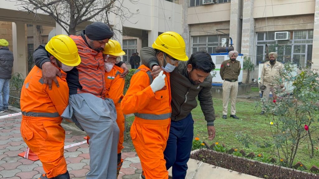 ਪਟਿਆਲਾ, 4 ਫਰਵਰੀ : (ਮਨੋਜ ਵਰਮਾ): ਭੁਚਾਲ ਦੀ ਸਥਿਤੀ ਵਿੱਚ ਪ੍ਰਭਾਵਸ਼ਾਲੀ ਬਚਾਅ ਕਾਰਜਾਂ ਦੀ ਰਿਹਰਸਲ ਕਰਨ ਲਈ ਐਨ.ਡੀ.ਆਰ.ਐਫ, ਬਠਿੰਡਾ ਦੀ 7ਵੀਂ ਬਟਾਲੀਅਨ ਨੇ ਅੱਜ ਜ਼ਿਲ੍ਹਾ ਪ੍ਰਬੰਧਕੀ ਕੰਪਲੈਕਸ, ਪਟਿਆਲਾ ਵਿਖੇ ਇੱਕ ਵਿਆਪਕ ਮੌਕ ਡ੍ਰਿਲ ਕੀਤੀ। ਇਸ ਦੌਰਾਨ ਐਨ.ਡੀ.ਆਰ.ਐਫ ਟੀਮ ਨੇ ਭੁਚਾਲ ਕਾਰਨ ਨੁਕਸਾਨੀਆਂ ਇਮਾਰਤਾਂ ਵਿਚ ਫਸੇ ਲੋਕਾਂ ਨੂੰ ਸੁਰੱਖਿਅਤ ਕੱਢਣ ਸਮੇਤ ਮੈਡੀਕਲ ਸਹਾਇਤਾ ਪ੍ਰਦਾਨ ਕਰਨ ਤੋਂ ਇਲਾਵਾ ਕੁਦਰਤੀ ਆਫ਼ਤਾਂ ਸਮੇਂ ਸੰਯਮ ਵਰਤਦੇ ਹੋਏ ਆਪ ਸੁਰੱਖਿਅਤ ਰਹਿਣ ਤੇ ਦੂਜਿਆਂ ਦੀ ਸੁਰੱਖਿਆ ਯਕੀਨੀ ਬਣਾਉਣ ਦੇ ਉਪਾਅ ਵੀ ਦੱਸੇ।