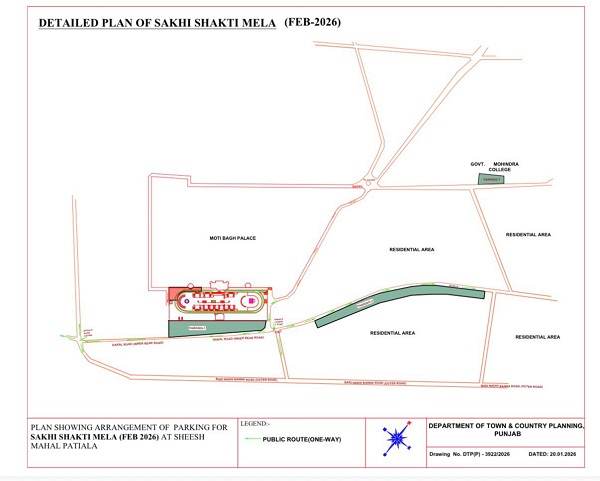 ਪਟਿਆਲਾ, 22 ਫਰਵਰੀ: ਪਟਿਆਲਾ ਦੇ ਇਤਿਹਾਸਕ ਸ਼ੀਸ਼ ਮਹਿਲ ਵਿੱਚ 21 ਫਰਵਰੀ ਤੋਂ 2 ਮਾਰਚ 2026 ਤੱਕ ਚੱਲ ਰਹੇ ‘ਪੰਜਾਬ ਸਖੀ ਸ਼ਕਤੀ ਕਰਾਫ਼ਟ ਮੇਲੇ’ ਦੌਰਾਨ ਵਧਦੀ ਭੀੜ ਨੂੰ ਦੇਖਦਿਆਂ ਟ੍ਰੈਫ਼ਿਕ ਪੁਲਿਸ ਨੇ ਸਖ਼ਤ ਪ੍ਰਬੰਧ ਕੀਤੇ ਹਨ। ਐਸ.ਐਸ.ਪੀ. ਵਰੁਣ ਸ਼ਰਮਾ ਦੇ ਦਿਸ਼ਾ-ਨਿਰਦੇਸ਼ਾਂ ਹੇਠ ਐਸ.ਪੀ. ਟ੍ਰੈਫ਼ਿਕ ਐਚ.ਐਸ. ਮਾਨ ਅਤੇ ਡੀ.ਐਸ.ਪੀ. ਪੁਨੀਤ ਸਿੰਘ ਚਾਹਲ ਨੇ ਨਵੀਂ ਟ੍ਰੈਫ਼ਿਕ ਯੋਜਨਾ ਦਾ ਐਲਾਨ ਕੀਤਾ ਹੈ।