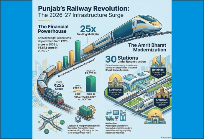 नई दिल्ली, 5 फरवरी 2026: पंजाब में 2026-27 के दौरान रेलवे क्षेत्र को बड़ा बढ़ावा मिला है। राज्य का वार्षिक रेल बजट 2009 में 225 करोड़ से बढ़कर 2026-27 में 5,673 करोड़ तक पहुंच गया है, जो करीब 25 गुना वृद्धि को दर्शाता है। इस निवेश का उद्देश्य रेल ढांचे को मजबूत करना, व्यापारिक गतिविधियों को गति देना और यात्रियों को बेहतर सुविधाएं प्रदान करना है।